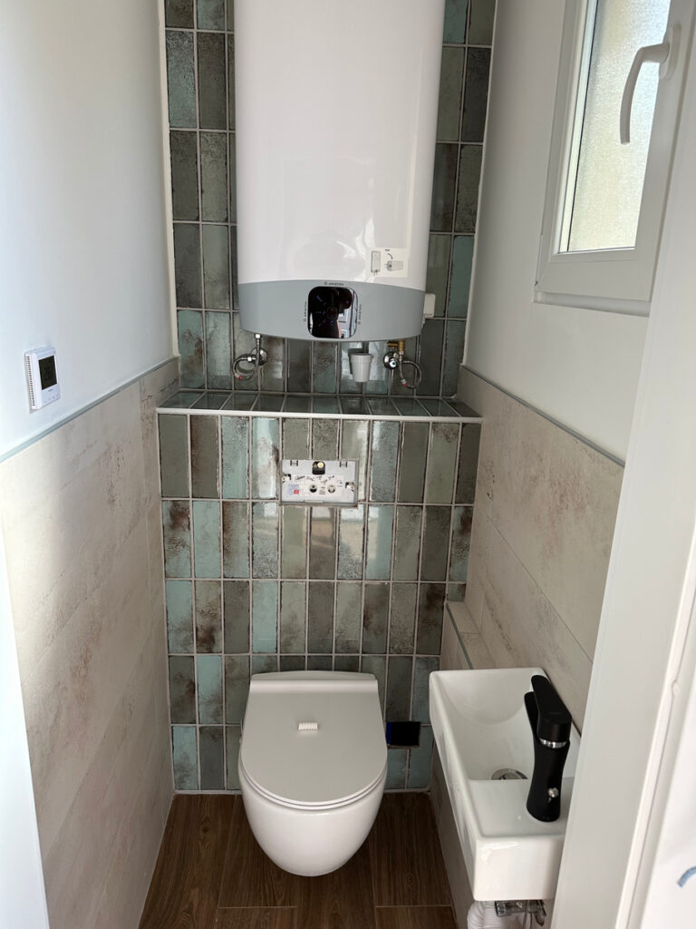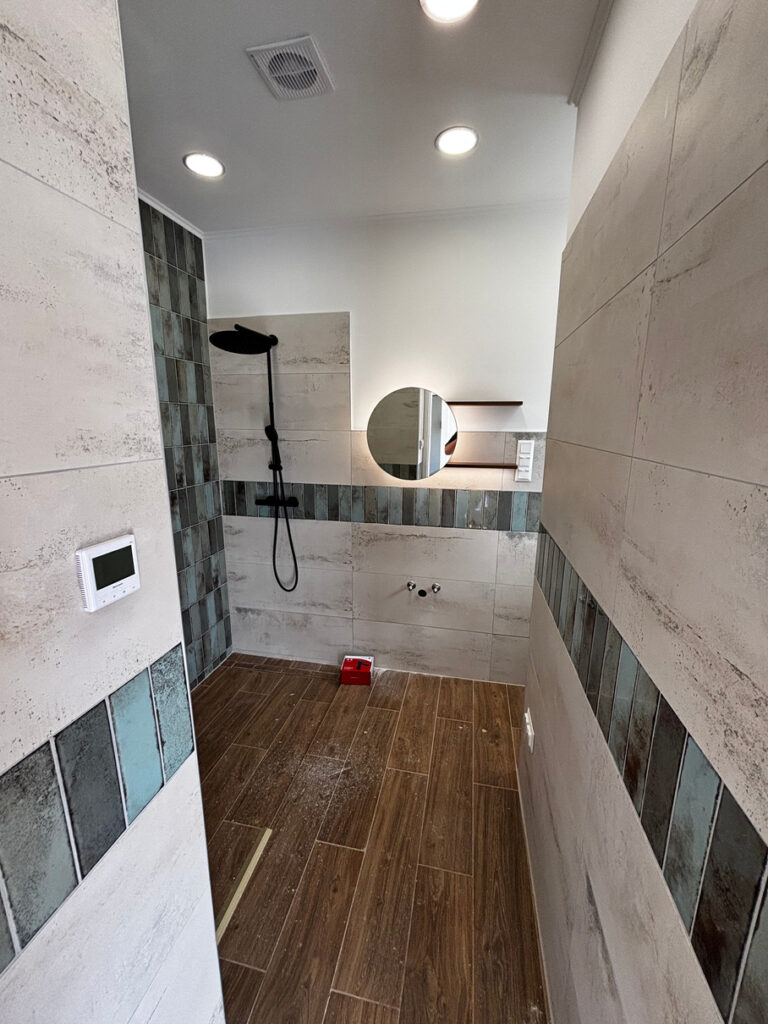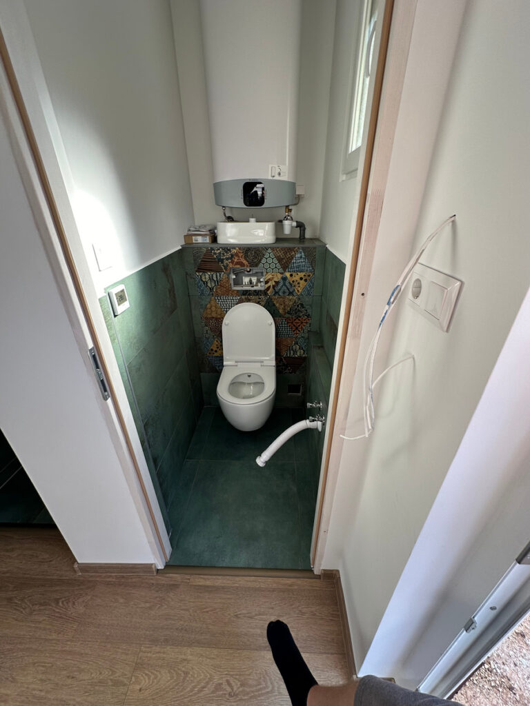 A WC és fürdőszoba falai 210 cm magasan burkolva.